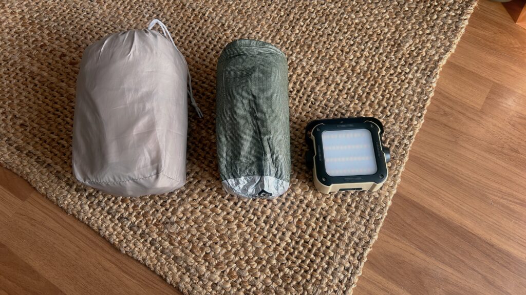 左からテントのカバー・中央はエマージェンシーシート・右はライト。